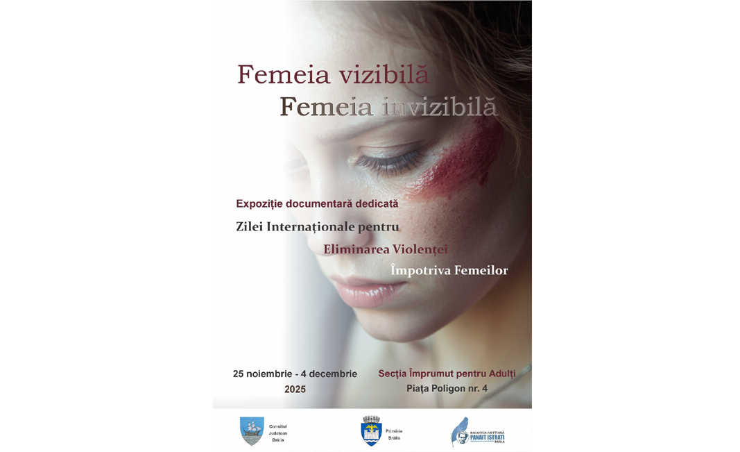 Secția Împrumut Carte pentru Adulți din cadrul Bibliotecii Județene „Panait Istrati” Brăila organizează, în perioada 25 noiembrie - 4 decembrie 2025, expoziția documentară dedicată Zilei Internaționale pentru Eliminarea Violenței împotriva Femeilor. Expoziția este intitulată „Femeia vizibilă, femeia invizibilă” și reunește volume din colecțiile bibliotecii publice, care abordează această temă.