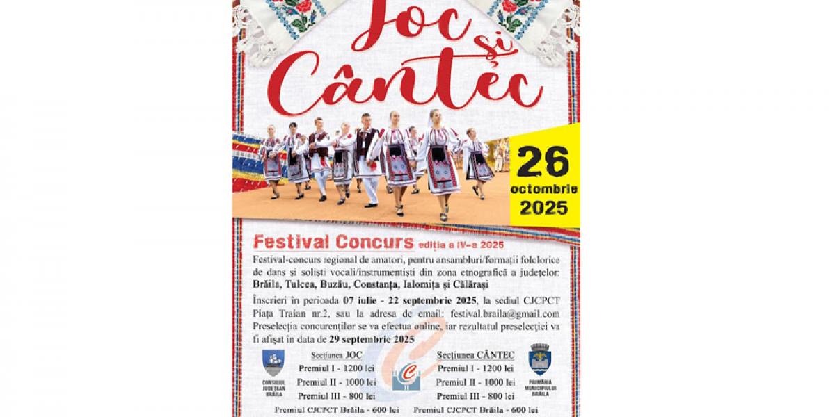 Pregătirile pentru cea de a IV-a ediție a Festivalului Concurs pentru amatori „Joc și cântec” au intrat în linie dreaptă. Organizat de Consiliul Județean, Centrul Județean pentru Conservarea și Promovarea Culturii Tradiționale și Primăria Municipiului Brăila, evenimentul are drept scop stimularea interesului pentru receptarea, păstrarea şi punerea în valoare a creaţiilor populare în rândul tinerilor amatori, a frumuseţii portului popular, apropierea de tradiţiile populare, dar şi descoperirea, cultivarea şi promovarea formaţiilor de dansuri populare, a ansamblurilor folclorice din județul Brăila și a soliștilor ce duc mai departe cântecul popular brăilean.