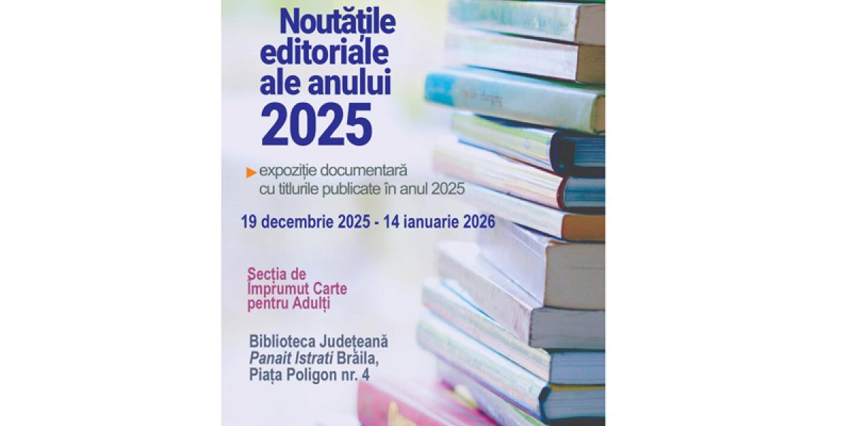 Intitulată „Noutățile editoriale ale anului 2025”, expoziția realizată de bibliotecar Silvia Iacob este deschisă publicului în perioada 19 decembrie 2025 - 14 ianuarie 2026. Ea oferă cititorilor o imagine de ansamblu asupra volumelor intrate în colecțiile bibliotecii pe parcursul anului 2025. Astfel, cei interesați de lectură pot descoperi atât cărți de specialitate din domenii precum științe sociale, istorie, educație, arte sau științe exacte, cât și volume de beletristică.